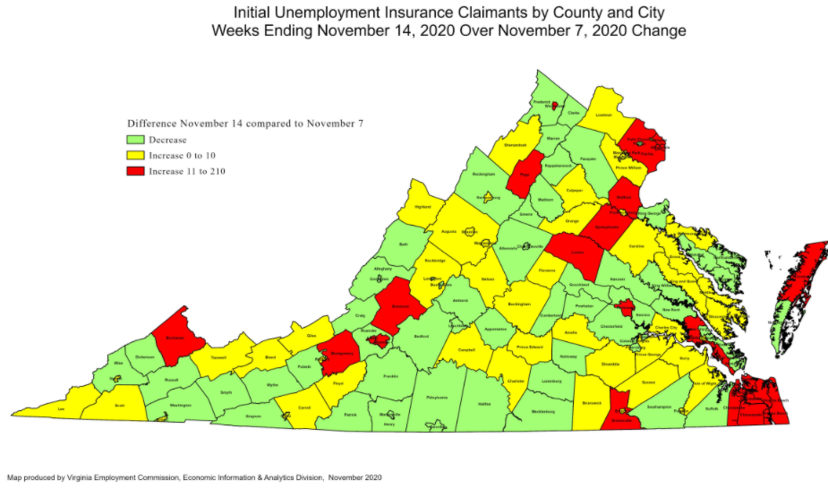 For the filing week ending November 14, the figure for seasonally unadjusted initial claims in Virginia was 11,088. The latest claims figure was an increase of 1,179 claimants from the previous week and rose to its highest level in nearly a month.