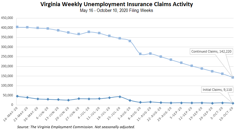For the filing week ending October 10, the figure for seasonally unadjusted initial claims in Virginia was 9,110. The latest claims figure was a decrease of 1,733 claimants from the previous week and continued the overall trend of lower claims volumes seen in recent months following April’s peak.
