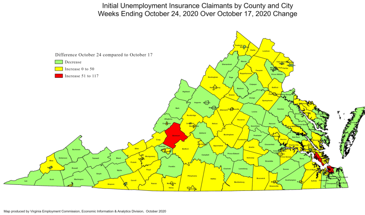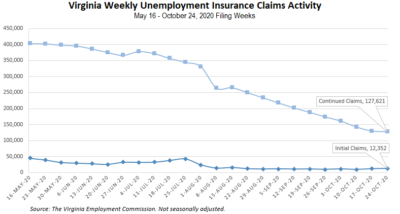 For the filing week ending October 24, the figure for seasonally unadjusted initial claims in Virginia was 12,352. The latest claims figure was an increase of 987 claimants from the previous week and rose to its highest level since mid-August.