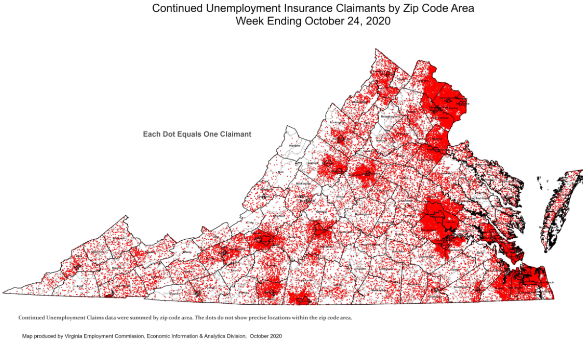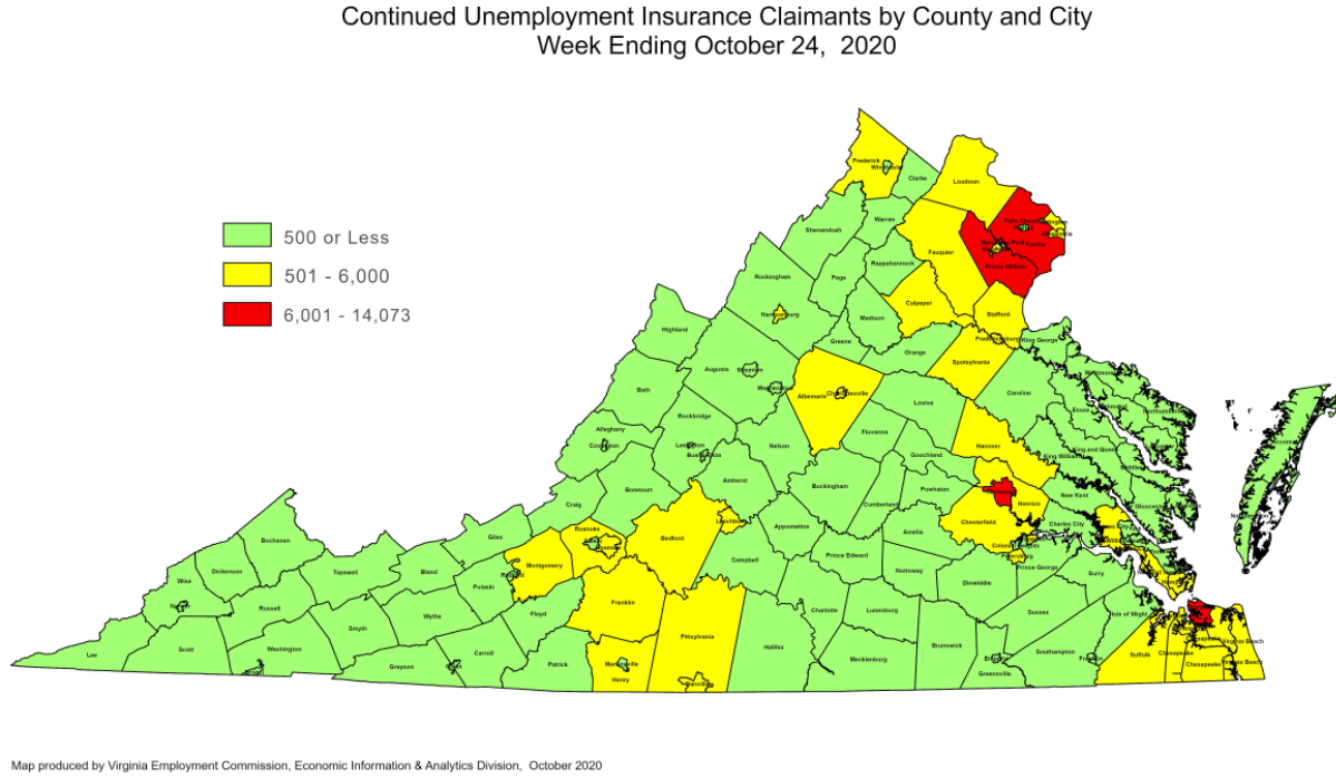 RICHMOND—The Virginia Employment Commission (VEC) announced that the number of continued claims filed during the October 24 filing week was over two thirds lower than its May 16 filing week peak, according to figures released today.