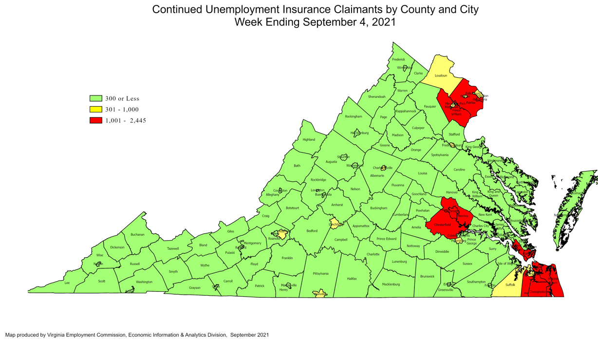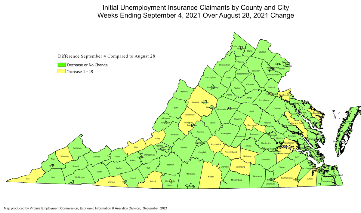 RICHMOND—The Virginia Employment Commission (VEC) announced that the number of initial claims filed during the most recent filing week were 45% lower than during the comparable week in 2020.